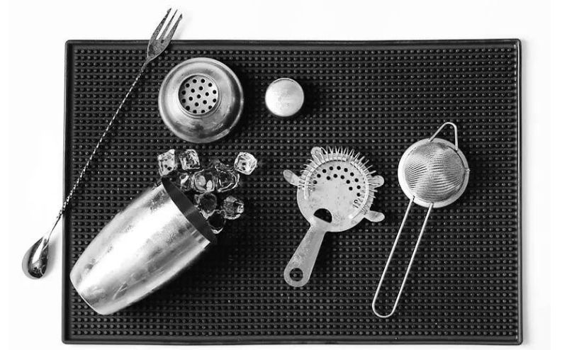 英文又叫 bar mat;吧台墊跟調酒本身沒有直接關係,但這種墊子一般大賣場可是找不到,除了橡膠材質防水,很多器具使用完可直接放在上頭晾乾,因為上頭的鉚釘凸起設計,讓水有更大面積可蒸發加速變乾。當然最重要的是這個吧台墊質感超讚,雖然不是必備,但超推!