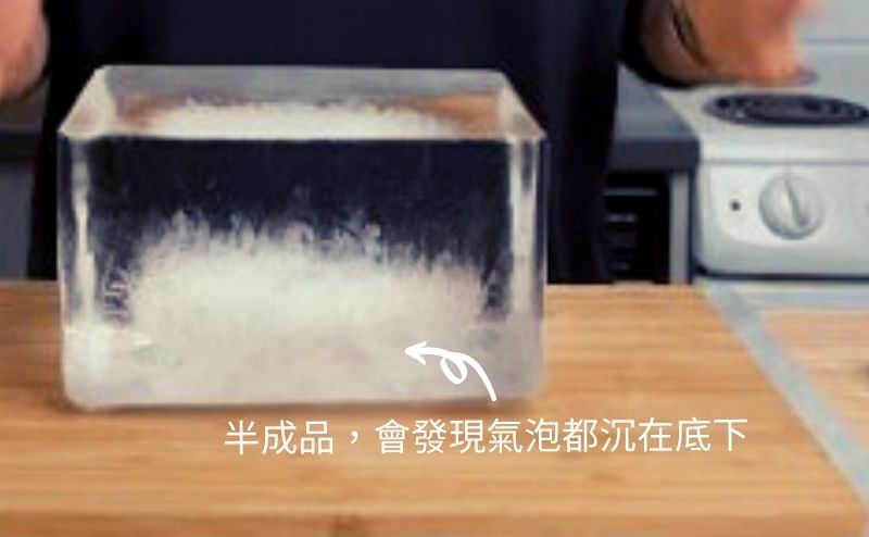 Tips:如果直接把水煮沸並滾大約2分鐘,冷卻成常溫後再拿去冰,會發現上面透明的部分變多,空氣變少。(大家自己斟酌看著辦)