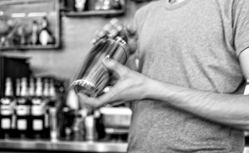 將冰塊與材料放入雪克杯,不管使用哪種雪克杯,不是蓋上後隨意搖一搖,需透過出力方式盡量冰塊在杯中旋轉而非撞擊,若過度撞擊會產生小碎冰並讓酒體太稀。