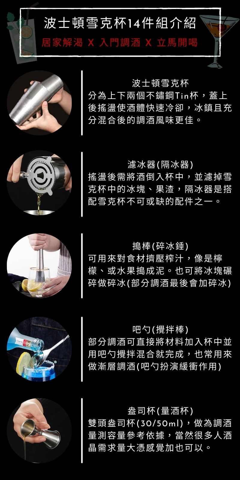 波士頓雪克杯分成上下兩個鋼杯,經過shake後,用手腕輕敲就可打開甚至只要稍微轉動一下可以。此外台灣常用水果元素於調酒中,波士頓雪克杯可先用一個鋼杯處裏搗碎果肉,搭配隔冰器 實用性最佳最廣。